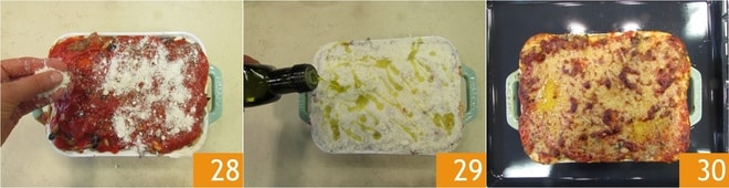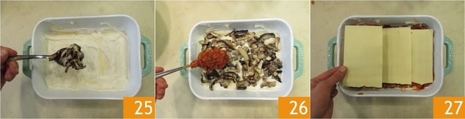 Maintenant, versez une partie des champignons 25, ensuite une couche de ragù 26 et une couche de pâte 27. Continuez à monter la lasagne en alternant les couches jusqu'à épuisement des ingrédients et obtenir quatre couches.
