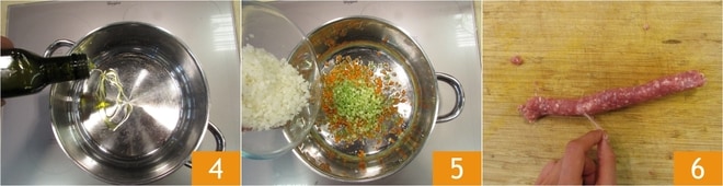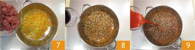 Ajoutez la saucisse émiettée 7, faites-la dorer à feu moyen pendant environ 5 minutes en remuant souvent. Déglacez avec du vin rouge 8 et laissez évaporer. Ensuite, ajoutez la purée de tomates 9, salez et faites cuire le ragù à feu moyen-doux pendant environ 1 heure : vous devez obtenir une consistance légèrement fluide.