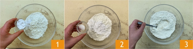 Pour préparer le layer cake, commencez par réaliser les 3 bases. Dans un bol, versez la farine, la levure tamisée 1, une pincée de sel 2 et mélangez 3.