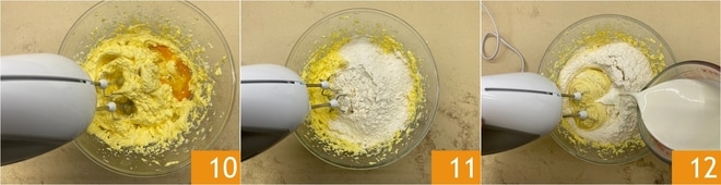 Mélangez jusqu'à ce qu'ils soient bien incorporés 10. Versez la farine en 3 fois 11, en l'alternant avec un peu de babeurre 12. À ce stade, réglez le batteur à basse vitesse pour ne pas trop travailler la pâte.