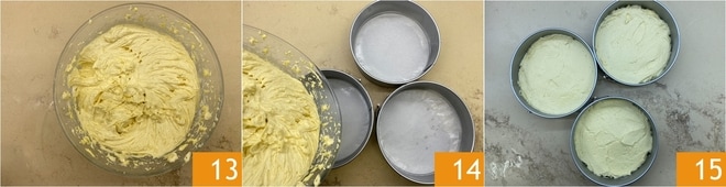 Continuez à travailler à basse vitesse jusqu'à obtenir une pâte homogène 13. Transférez-la ensuite dans 3 moules de 20 cm préalablement beurrés sur les bords et tapissés de papier sulfurisé au fond 14. Nivelez bien la surface 15 et faites cuire dans un four statique préchauffé à 180°C pendant 25 minutes.