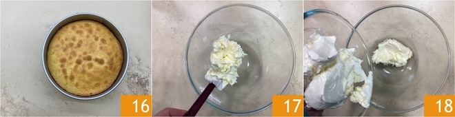 Puis sortez du four et laissez refroidir 16. Entre-temps, occupez-vous du glaçage. Versez dans un bol le beurre mou 17 et ajoutez le fromage à tartiner 18.