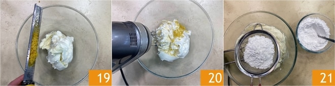 Ajoutez le zeste de citron râpé 19 et mélangez avec un batteur électrique pendant 3 minutes 20. Ajoutez le sucre glace tamisé en 3 fois 21.