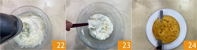 Mélangez toujours avec le batteur électrique entre chaque ajout 22, jusqu'à obtenir une crème lisse et épaisse 23. Dès que les bases sont froides, démoulez-les et nivelez la partie supérieure 24.
