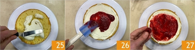 Ajoutez une généreuse couche de glaçage, en l'étalant bien avec une spatule 25. Veillez à en mettre davantage sur les bords pour créer une sorte de creux que vous remplirez avec de la confiture 26. Ajoutez maintenant quelques framboises, en les cassant avec les mains 27.
