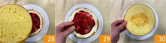 Placez un deuxième disque de gâteau dessus 28 et réalisez encore une couche de crème et une de confiture. Ajoutez encore quelques framboises 29 et recouvrez avec le dernier disque de gâteau, en le retournant, de sorte que la partie qui était à la base du moule soit vers le haut 30.