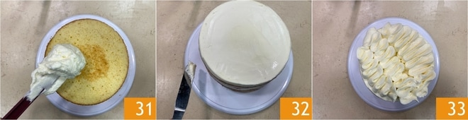 Aidez-vous d'une spatule pour appliquer le glaçage sur le dessus du gâteau 31 et sur les bords, en le nivelant et le lissant bien, de sorte à le recouvrir entièrement, mais en mettant juste un fin film sur les bords 32. Transférez le reste de crème dans une poche à douille avec une douille biseautée et décorez la surface du gâteau 33.