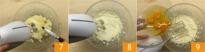 Ajoutez les graines que vous aurez extraites de la gousse de vanille 7 et continuez de fouetter le tout 8. Ensuite, ajoutez les œufs un par un 9, puis les deux blancs d'œufs.