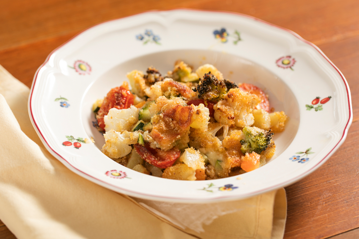 Vous ne savez pas quel accompagnement préparer ce soir ? Voici une recette très simple et polyvalente, qui plaira aux grands comme aux petits : légumes au fromage ! Coupez en dés les légumes que vous avez sous la main (ici brocoli, chou-fleur, courgettes, carottes, pommes de terre et tomates cerises), mélangez-les à la scamorza fumée et transférez-les dans un plat recouvert d'une généreuse couche de chapelure et de Parmigiano… en l'espace d'une demi-heure vous sortirez du four un plat savoureux et coloré, qui peut aussi être servi comme plat principal végétarien.