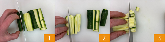 Pour préparer les légumes au fromage, commencez par les courgettes : après avoir coupé les extrémités et les avoir partagées en deux, coupez-les d'abord en rondelles 1, puis en bâtonnets 2 et enfin en dés d'environ 1 cm 3.