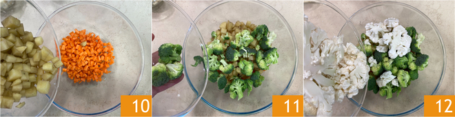 Dans un grand saladier, versez les carottes, les pommes de terre 10, les brocolis 11 et le chou-fleur 12.