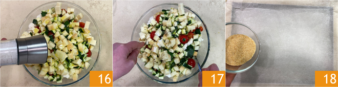 Salez 16, poivrez et mélangez bien le tout 17. Maintenant, chemisez une plaque de cuisson avec du papier sulfurisé et saupoudrez la base avec la moitié de la chapelure 18.