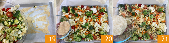 Répartissez les légumes dans le plat 19, puis recouvrez avec la chapelure restante 20 et le Parmigiano Reggiano râpé 21.