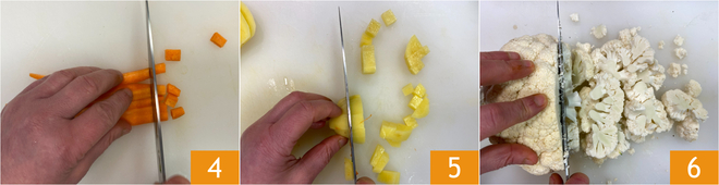 Faites la même chose avec les carottes 4 et les pommes de terre 5, après les avoir épluchées. Hachez grossièrement le chou-fleur 6.