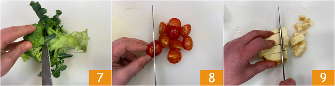 Nettoyez le brocoli et détachez de petites fleurettes 7, puis coupez les tomates cerises en deux 8. Enfin, coupez également la scamorza en dés de la même taille 9.