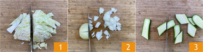 Pour préparer les légumes sautés avec sauce soja et gingembre, la première chose à faire est de laver les légumes et de les couper en julienne, en commençant par le chou, en le débarrassant de son trognon interne 1. Pelez et émincez l'oignon 2. Éliminez les extrémités et coupez les courgettes en morceaux irréguliers d'une épaisseur d'environ 4-5 mm 3.