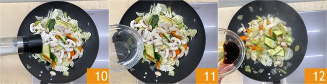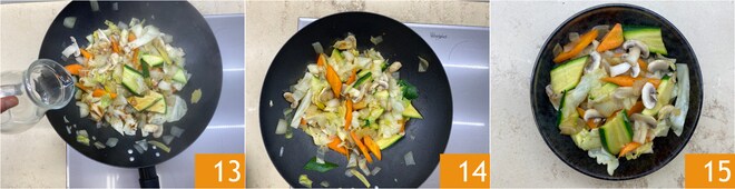 Salez 10 et poivrez 11, ajoutez un peu d'eau 11 et faites sauter pendant environ 8 minutes. Remuez souvent pour éviter de les brûler. Lorsque les légumes et les champignons sont cuits, ajoutez la sauce soja 12.
