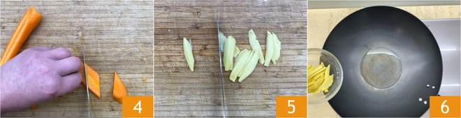 Pelez et émincez les carottes, en gardant la même épaisseur que les courgettes 4. Épluchez et émincez également le gingembre 5. Dans le wok, chauffez l'huile de graines, puis ajoutez le gingembre 6.