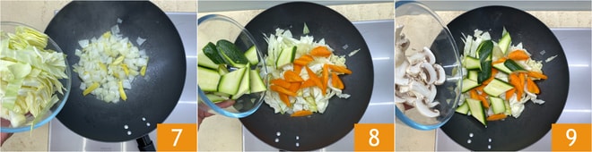 Ajoutez également les oignons et laissez mijoter à feu doux, puis ajoutez les autres légumes : le chou 7, les carottes, les courgettes 8 et les champignons nettoyés 9.