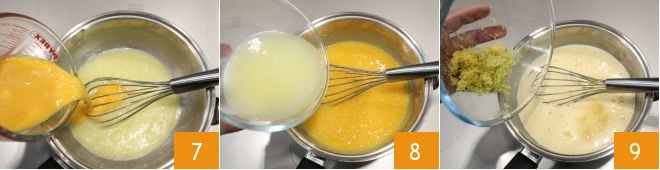 et versez-les dans la crème 7 en continuant à mélanger, ajoutez également le jus de citron dans lequel vous avez dissous la maïzena 8, le zeste râpé des citrons 9 et continuez à mélanger en épaississant la crème à feu doux, maintenez le feu très bas et faites simplement frémir l'eau du bain-marie, pour éviter que l'œuf ne coagule ; la crème ne doit jamais bouillir.