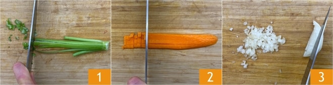 Pour réaliser les lentilles en cocotte-minute, commencez par préparer les légumes pour le soffritto : nettoyez et hachez finement le céleri 1, la carotte 2 et l'oignon 3.