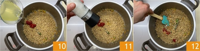 Enfin, versez le bouillon 10, salez 11 et poivrez, puis mélangez bien le tout 12.