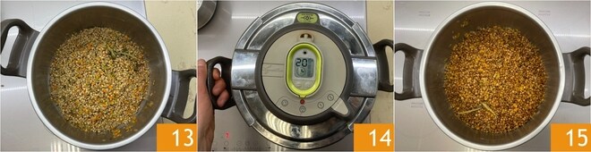 À ce stade 13, fermez la cocotte avec le couvercle et fermez la valve 14, augmentez la flamme et attendez qu'elle soit sous pression. Dès que vous entendez le sifflement, réduisez à nouveau la flamme et faites cuire pour la moitié du temps indiqué sur l'emballage des lentilles : nous les avons cuites pendant 24 minutes. Une fois le temps de cuisson écoulé, éteignez le feu et soulevez la valve pour libérer toute la vapeur (faites toujours attention à ne pas vous brûler). Ce n'est qu'alors que vous pourrez ouvrir le couvercle. Rectifiez l'assaisonnement et servez vos lentilles en cocotte-minute comme vous le préférez 15 !