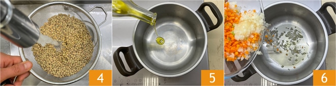 Rincez les lentilles sous l'eau courante 4. Mettez sur le feu une cocotte-minute d'une capacité de 4,5 litres, versez un filet d'huile 5 et ajoutez les légumes 6.