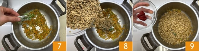 Faites revenir le soffritto pendant environ 5 minutes, puis ajoutez la sauge et le romarin liés ensemble avec une ficelle de cuisine 7. Ajoutez les lentilles 8 et le concentré de tomate 9.