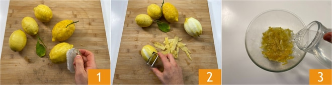 Pour préparer le limoncello rapide, lavez bien les citrons en utilisant une petite brosse 1. Prélevez la peau avec un économe, en grattant seulement la partie jaune 2 et pas la partie blanche qui serait amère. Transférez les zestes dans un bol et couvrez avec l'alcool 3.
