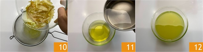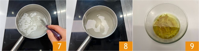 Mélangez 7 jusqu'à ce que le sucre soit complètement dissous 8. À ce stade, éteignez le feu et laissez refroidir complètement. Reprenez ensuite les zestes qui auront terminé la macération 9.