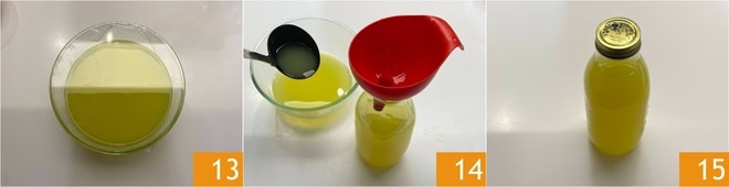 Couvrez avec du film plastique 13, ou en alternative, transférez le limoncello dans un récipient avec un couvercle hermétique 14. Fermez bien 15 et laissez reposer dans un endroit frais et sombre pendant 10 jours. Passé ce temps, vous pourrez mettre le limoncello rapide au frigo ou au congélateur et le déguster frais !