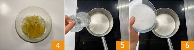 Choisissez un bol approprié, de manière à ce que les zestes soient complètement couverts par l'alcool 4. Couvrez avec du film plastique et laissez macérer dans l'obscurité pendant au moins 1 jour, si vous n'êtes pas pressé, même 3 jours. Passé ce temps, préparez le sirop. Dans une petite casserole, versez l'eau 5 et le sucre 6.