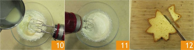 Versez le mélange de crème et gélatine sur la crème de yaourt 10 et travaillez encore pendant 2 minutes avec les fouets électriques 11. Mettez de côté la crème. Coupez des tranches de pandoro de 1 cm d'épaisseur, éliminez le bord 12