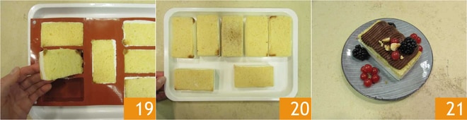 Remplissez les formes jusqu'à ½ cm du bord 16. Disposez les 7 rectangles de pandoro restants par-dessus 17. Couvrez les moules avec une plaque 18 pour les rendre parfaitement plats et transférez les lingots au congélateur pendant au moins 3 heures.