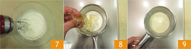 Mettez de côté le mélange monté 7. Dans une petite casserole, versez les autres 20 g de crème fraîche et ajoutez la gélatine précédemment trempée avec une partie de l'eau de trempage 8 pour un poids total de 25 g. Chauffez les ingrédients jusqu'à ce que la gélatine soit complètement dissoute 9.