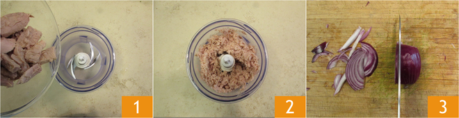 Pour préparer les linguine à la crème de thon, mettez le thon égoutté dans le mixeur 1 et mixez-le pour le rendre fin 2. Épluchez et tranchez l'oignon rouge 2.