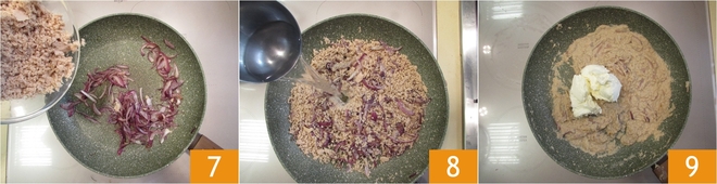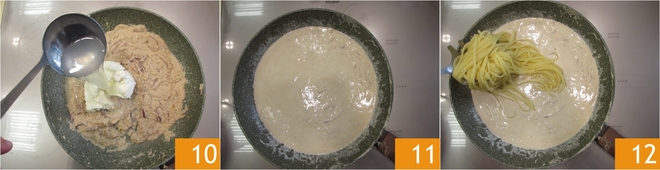 Salez les oignons étuvés, ajoutez le thon haché 8 et mélangez le tout. Faites cuire quelques minutes. Versez une louche d'eau de cuisson des pâtes 8 et le fromage crémeux 9.