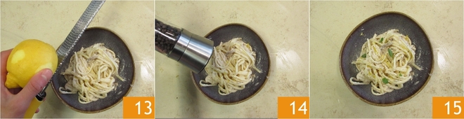Servez les linguine à la crème de thon bien chaudes en assaisonnant les plats avec du zeste de citron râpé 13, du poivre noir 14 et de l'origan frais 15.