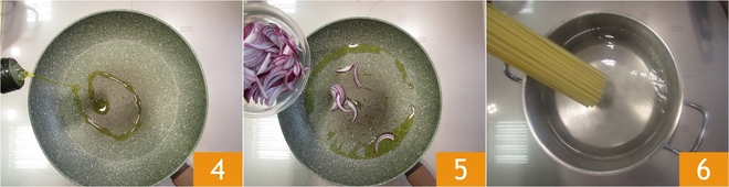 Chauffez un filet d'huile d'olive extra vierge dans une grande poêle 4, ajoutez l'oignon 5 et faites-le revenir à feu doux. Faites cuire les linguine dans une grande quantité d'eau salée 6.