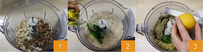 Pour préparer les linguine au pesto d'amandes, commencez par mixer finement les amandes émondées et non émondées dans un mixeur 1. Si vous ne possédez pas de mixeur, vous pouvez hacher les amandes avec un pilon ou les émincer avec un couteau. Lorsque les amandes sont hachées, ajoutez les feuilles de basilic et l'huile 2; salez et poivrez. Lavez bien un citron non traité, éliminez les deux extrémités et râpez le zeste pour l'ajouter au pesto d'amandes 3.