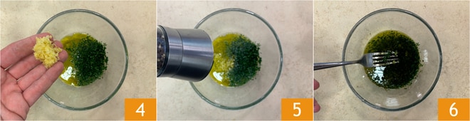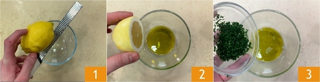 Ajoutez un peu de zeste de citron râpé 4. Assaisonnez avec du sel et du poivre 5 et émulsionnez 6.