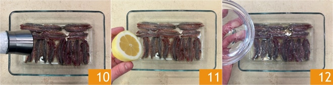 Mettez les anchois dans un plat, assaisonnez avec du sel 10, arrosez avec le jus de citron 11 et ajoutez de l'eau jusqu'à les recouvrir complètement 12. Laissez mariner pendant 10 minutes.