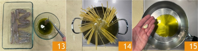 Retirez les anchois de la première marinade et plongez-les dans la citronnette 13. Pendant ce temps, faites cuire les linguine dans de l'eau bouillante salée 14. Dans une poêle, versez un filet d'huile et ajoutez l'ail 15, et laissez frire pendant quelques minutes.