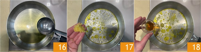 Retirez l'ail et versez une louche d'eau de cuisson des pâtes 16, ajoutez un peu de zeste de citron râpé 17 et un filet de colature d'anchois 18.