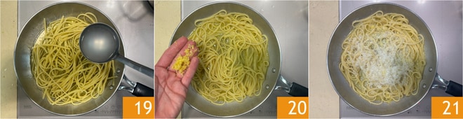 Égouttez les linguine et mettez-les dans la poêle, versez une louche d'eau de cuisson des pâtes 19. Ajoutez le reste du zeste de citron râpé 20, le pecorino 21 et mélangez jusqu'à obtenir une sauce crémeuse.