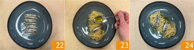 Dressez le plat en disposant 5 anchois marinés 22, un nid de linguine, la sauce crémeuse et complétez en mettant sur la surface des pâtes deux autres anchois marinés et un filet de citronnette 23. Les linguine avec anchois marinés et pecorino sont prêtes à être dégustées 24.