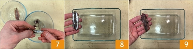 Passez maintenant au nettoyage des anchois. Prenez la tête entre vos doigts, au niveau des branchies 7, et exercez une légère pression pour l'enlever. En tirant, vous éliminerez la tête, l'arête et les viscères 8. Ouvrez les anchois en deux et rincez-les pour éliminer toutes les impuretés 9.