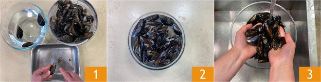 Pour préparer les linguine moules et fleurs de courgette, commencez par le Comment nettoyer et ouvrir les moules. Éliminez les impuretés externes avec un petit couteau 1 et placez-les dans un bol d'eau au fur et à mesure. Une fois terminé, rincez-les soigneusement 3.