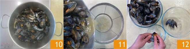 Une fois ouvertes, égouttez les moules 11 et réservez le liquide. Décortiquez maintenant les moules en en réservant quelques-unes entières.